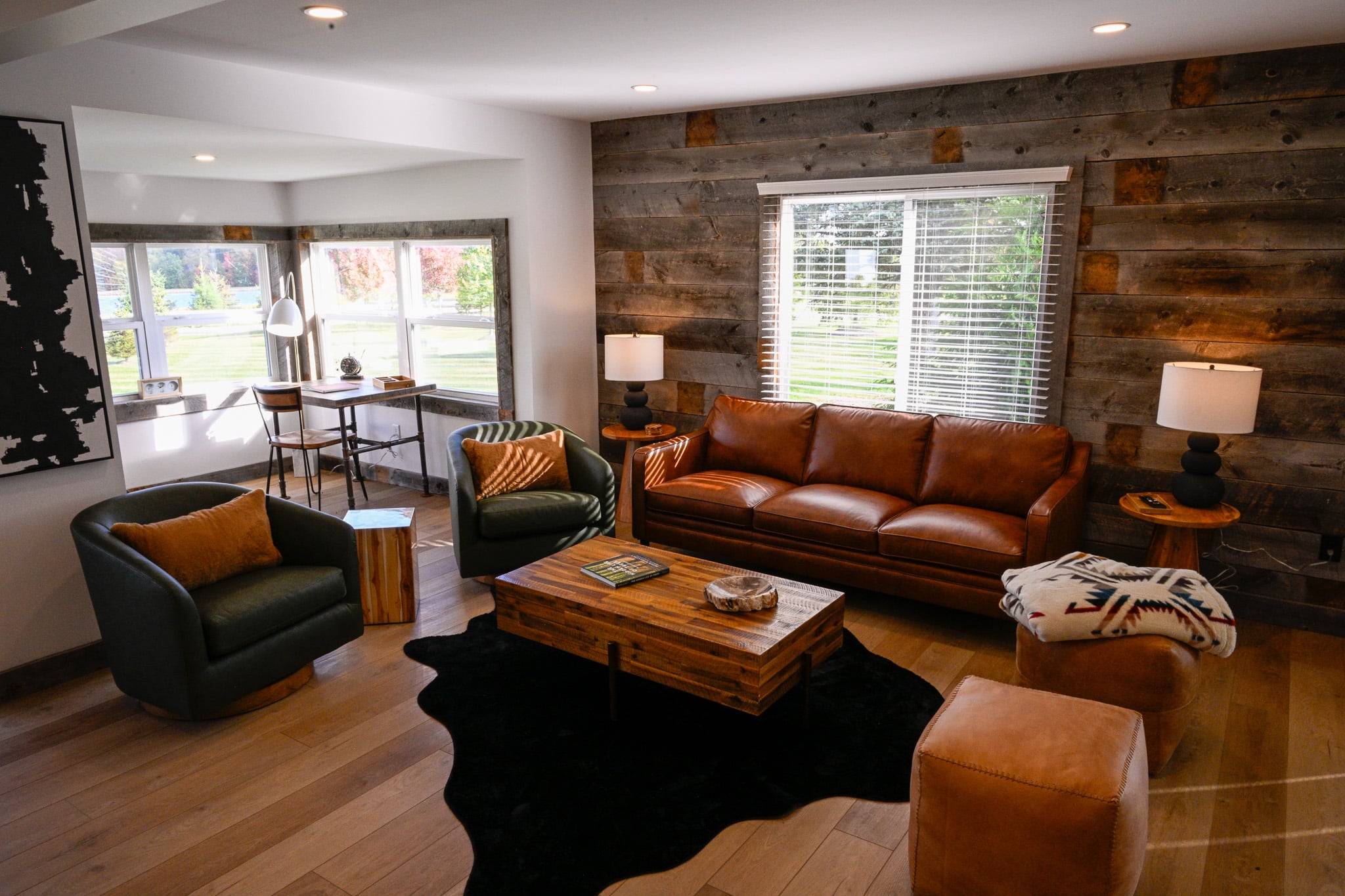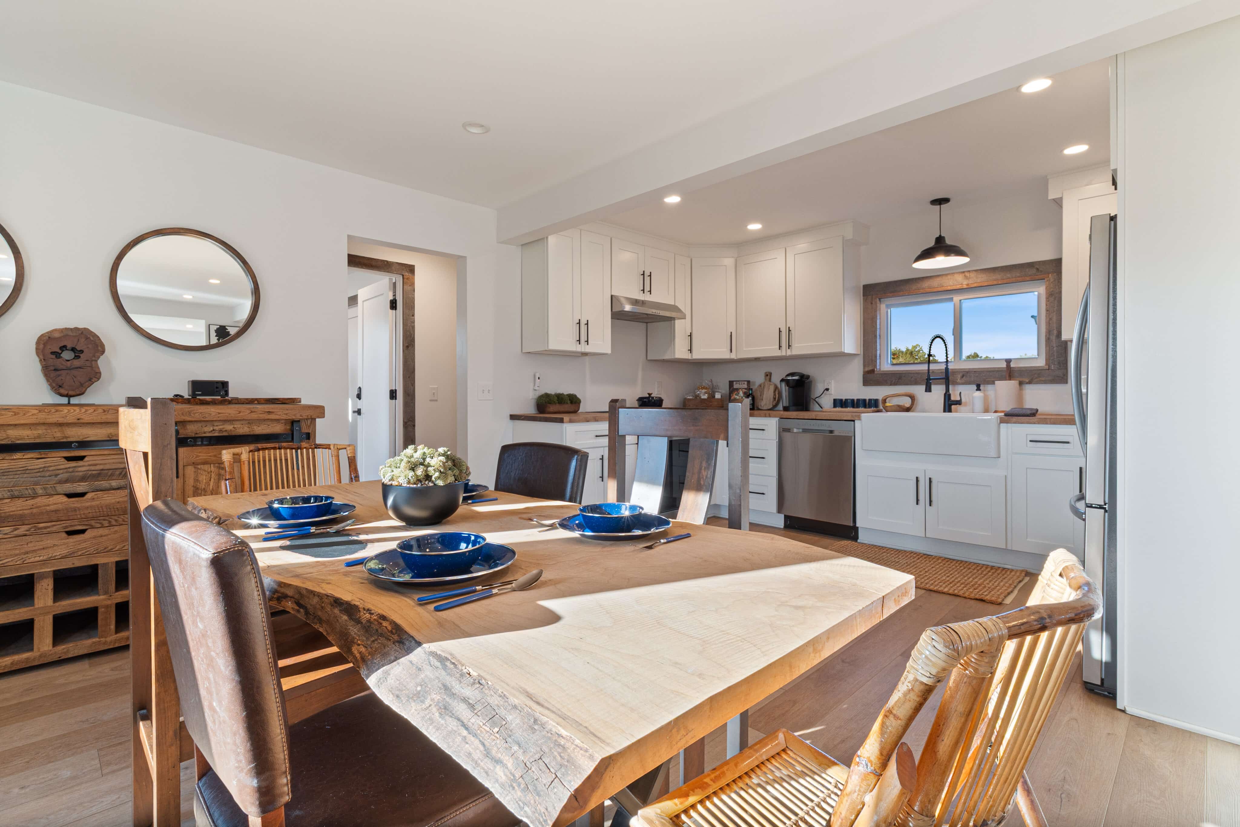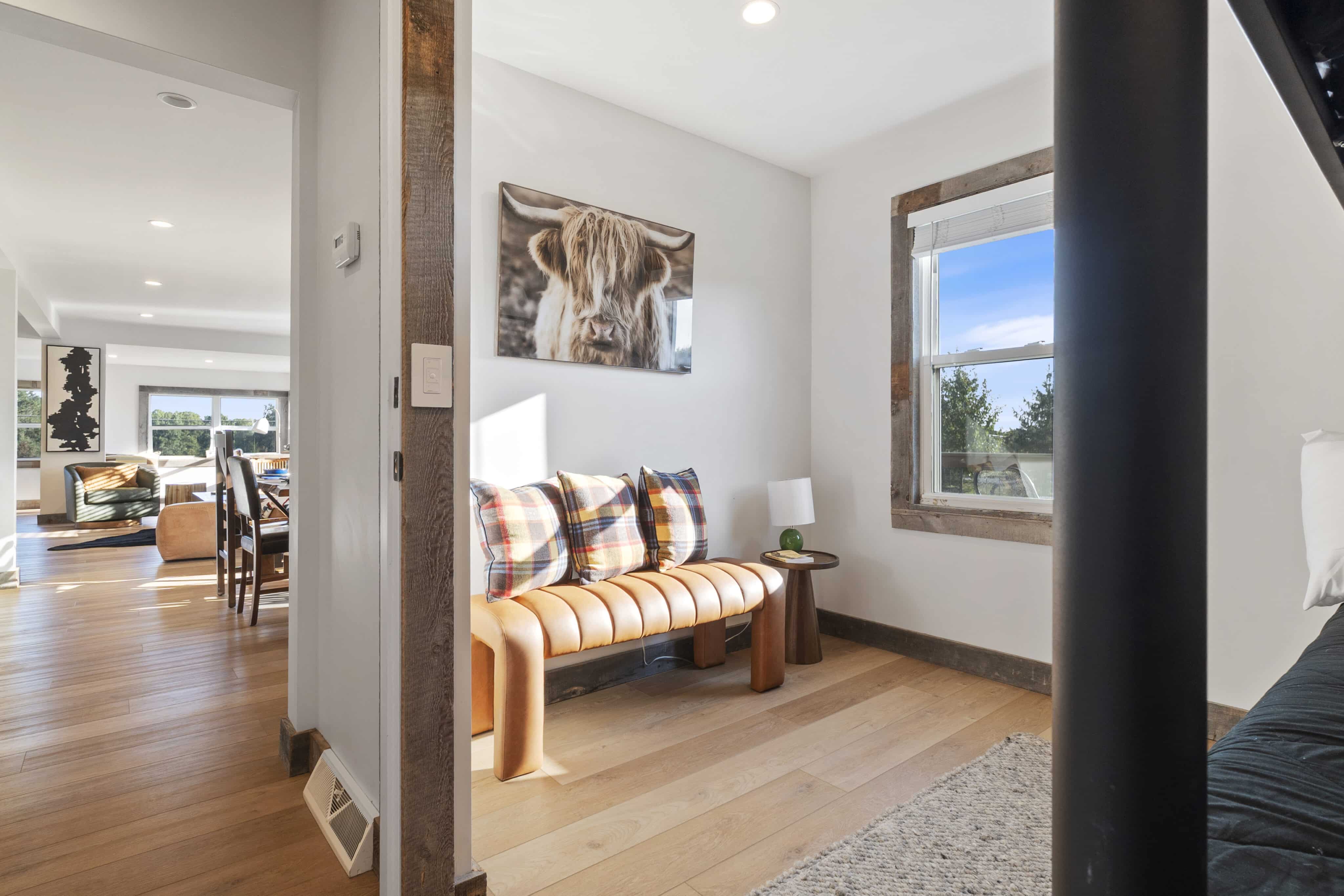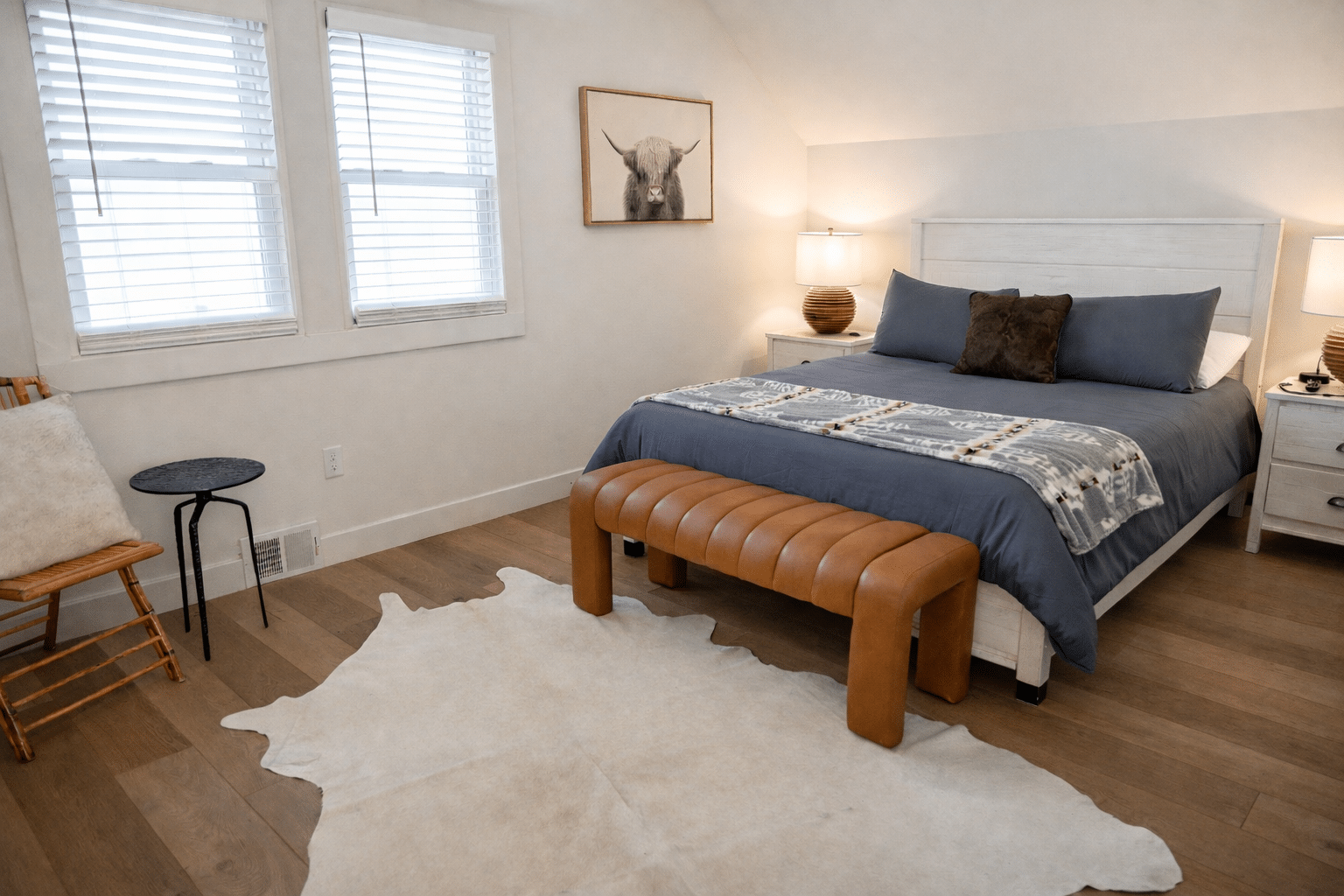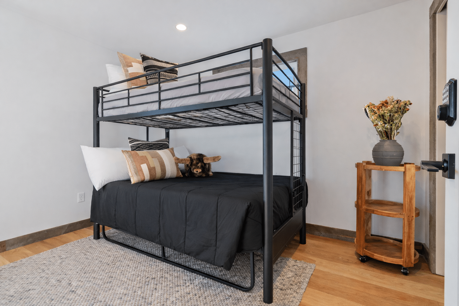 Highland House features three beautifully furnished bedrooms, including a master suite with a queen bed. Two additional bedrooms offer a queen bed with thoughtfully curated décor and bunk beds. The open-concept living area includes a cozy lounge space with large windows, allowing natural light to fill the home and bring the surrounding landscape indoors.