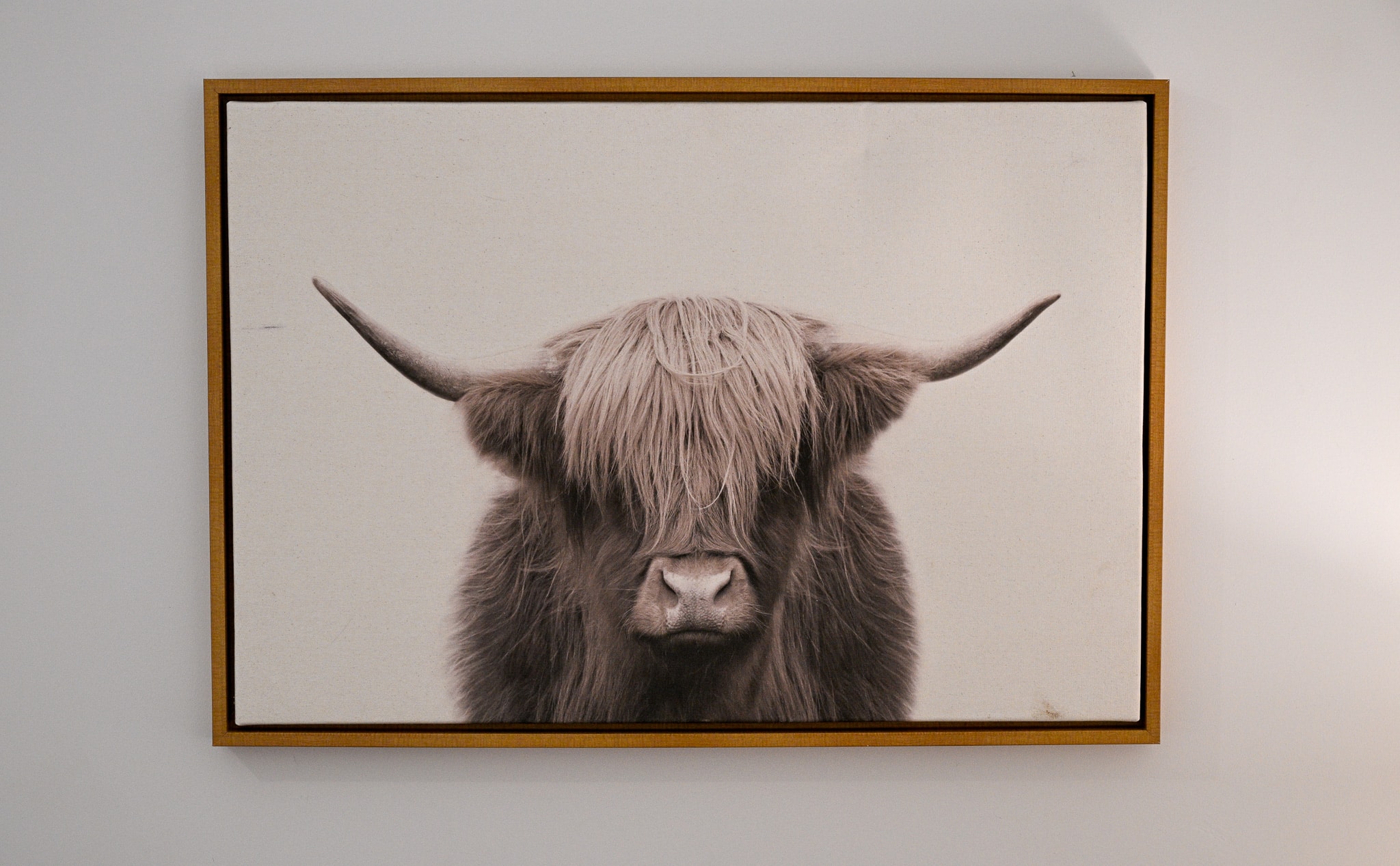 Highland cow portrait with shaggy coat and horns in a rustic wooden frame.