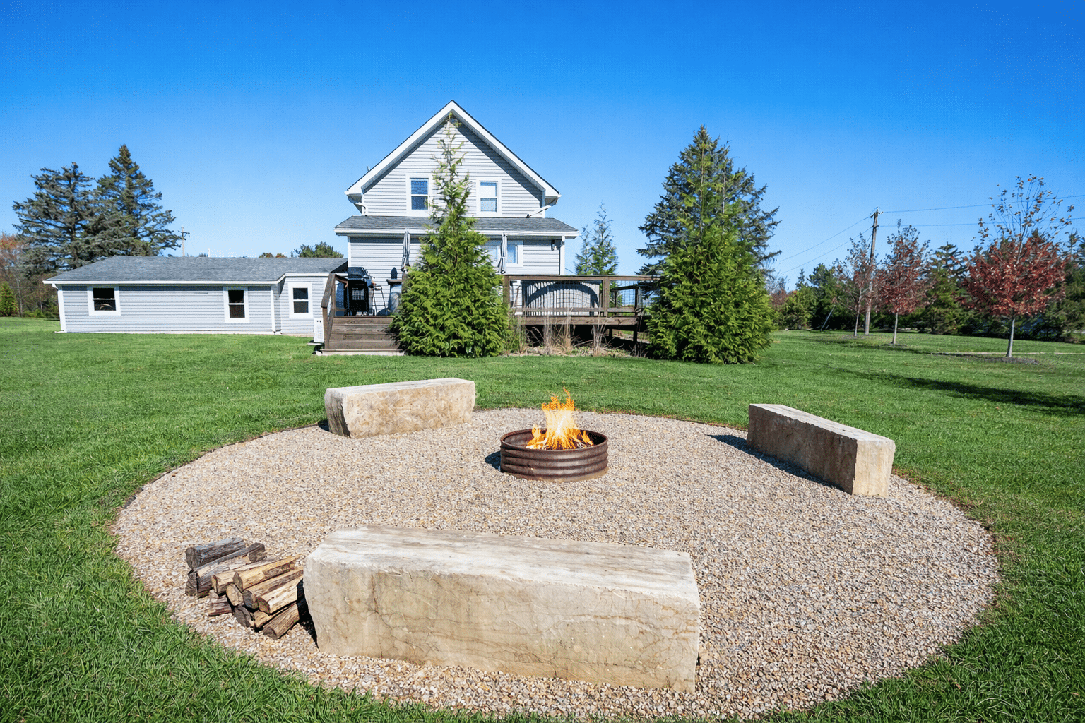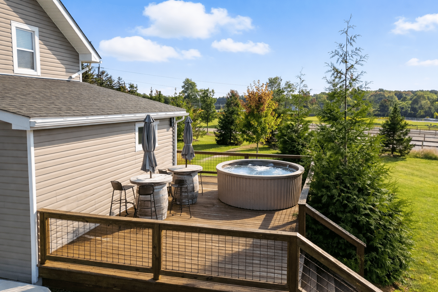 Step outside onto the private deck featuring comfortable seating, a hot tub, and peaceful views of the surrounding farmland. A propane grill is available for outdoor meals, and the spacious yard provides room for kids to play or for guests to unwind after a day exploring the Grand River Valley.
