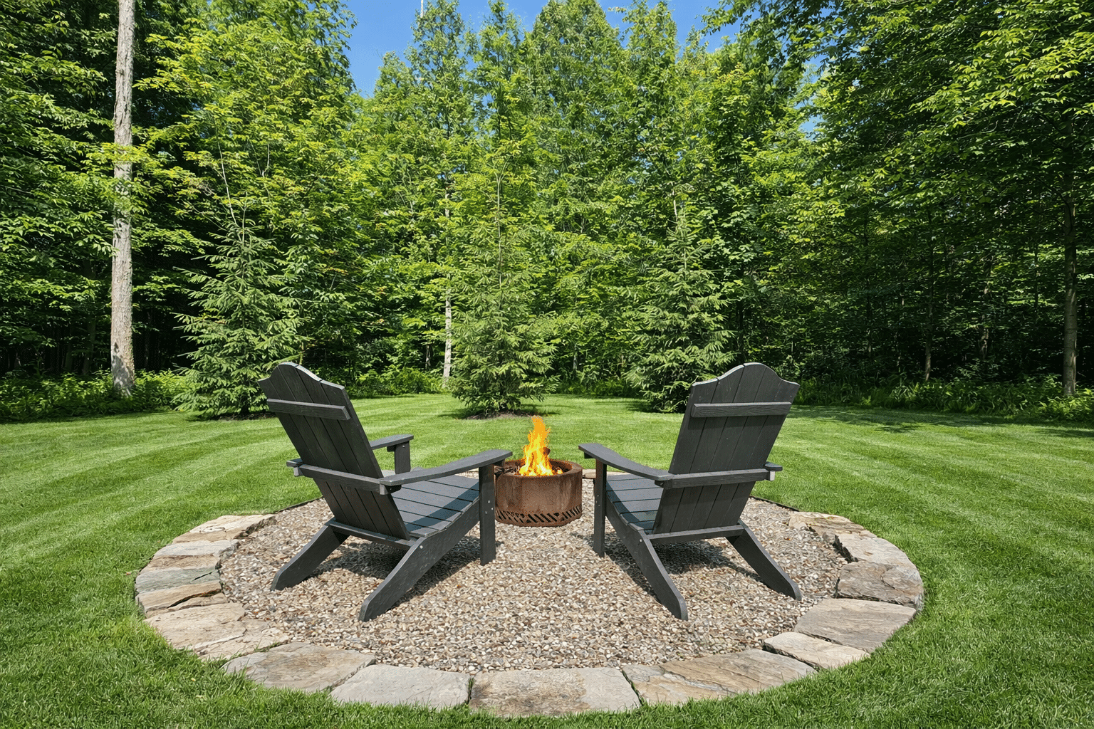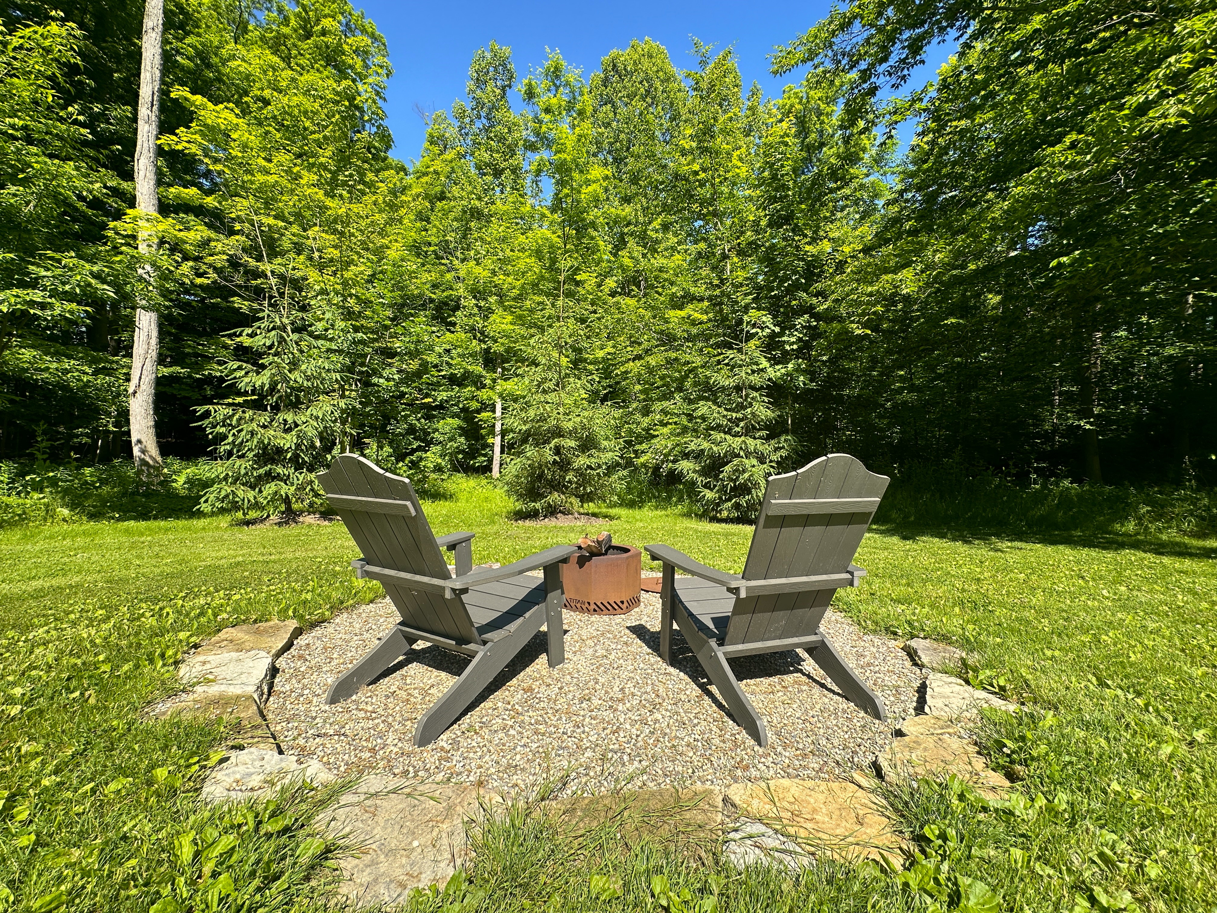 Cozy forest seating area with Adirondack chairs and fire pit surrounded by lush greenery.