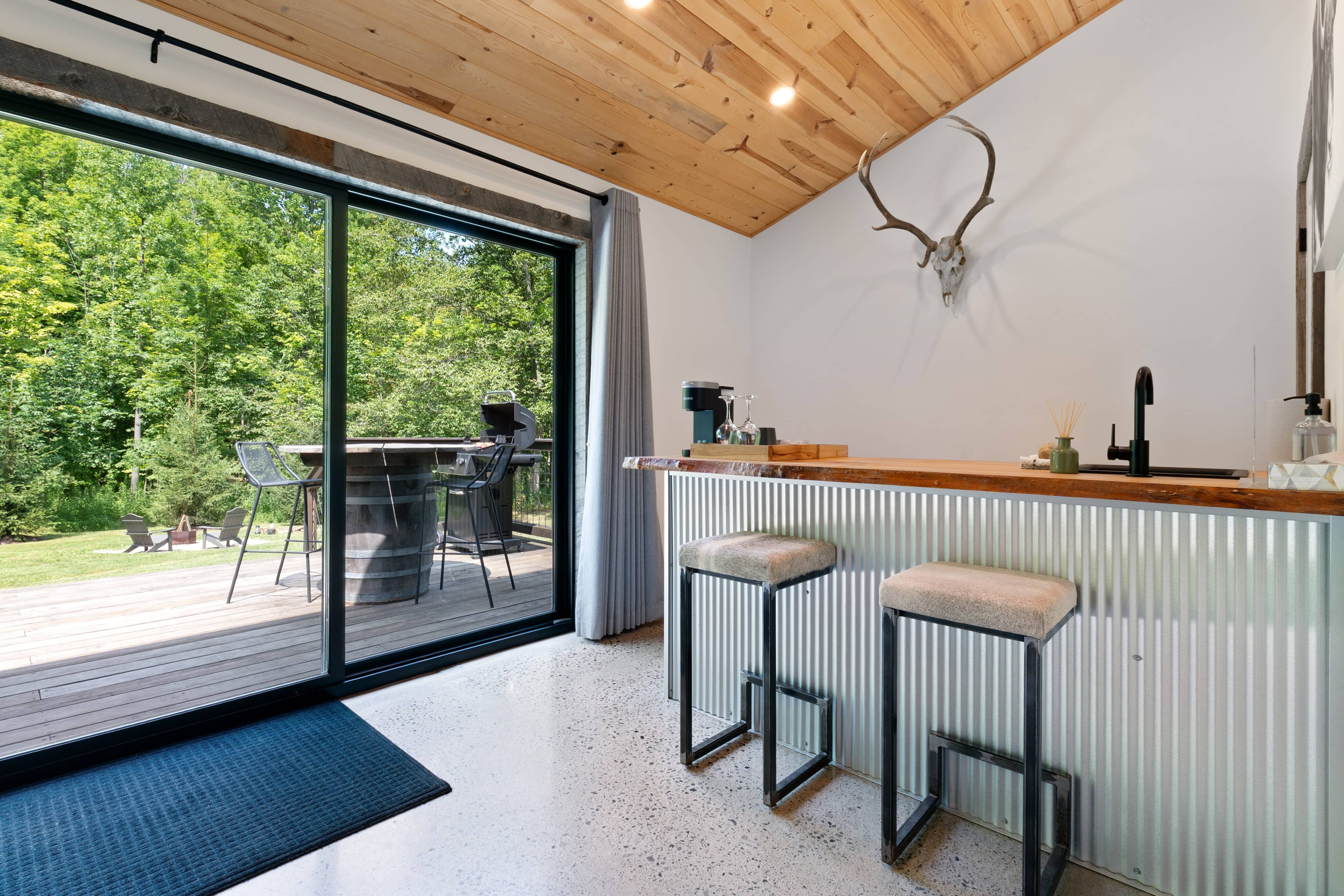 Relax on your private deck with a barbecue grill and outdoor dining area, perfect for enjoying the serene surroundings and fresh air.