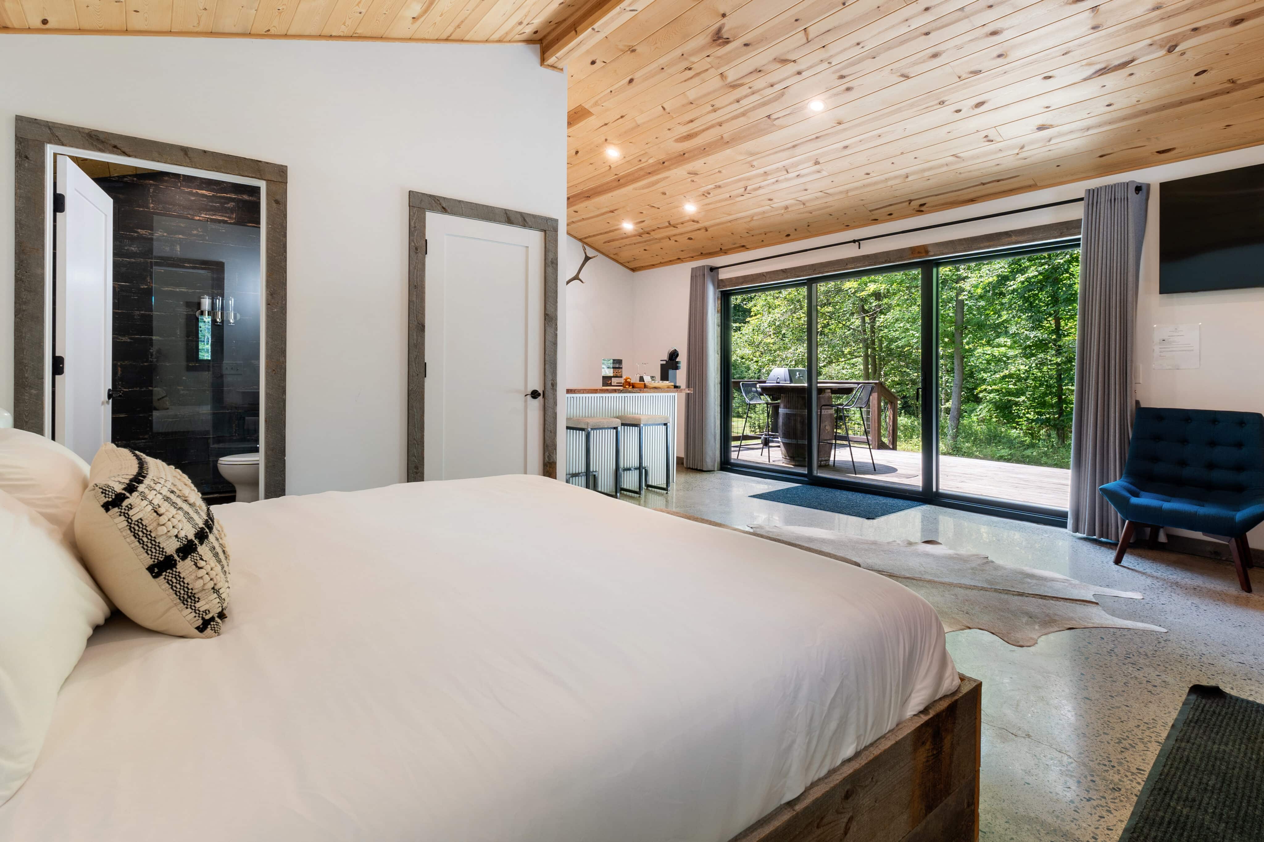 Enjoy high-speed Wi-Fi, a Smart TV, private hot tub, and a kitchenette equipped with a Keurig coffee machine, microwave, and mini fridge, ensuring all the comforts of home.